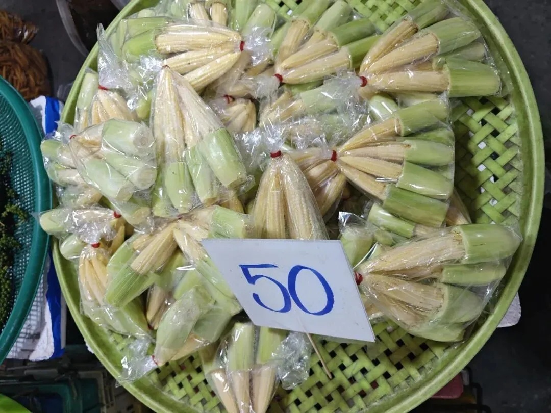泰国市场上的玉米笋,50泰铢一包,约合人民币十多块钱